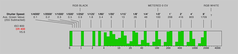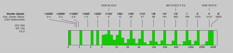 - The values and histogram are from the green raw channel, with 255 subtracted out. In the RAW format, black starts at the value of 255. In this particular exposure sequence using shaded sunlight the Red and Blue channel lagged about a stop behind in the values shown here for the green channel.