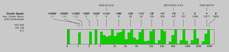 As expected, numerically it's just about the same as the ISO 200 sequence. The ISO gain is being applied before the RAW file is written and the metered center gray stays at the same point in the scale. There is some noise at the extreme lower end which is causing some confusion around the averaging of green values, oddly 1/4000 actually has a higher average than 1/2000. (Also note that I missing a value for the 1/250 exposure, I inadvertently missed taking that particular shot).