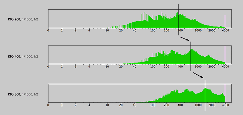 As would be expected, each increase in ISO without compensation by aperture or shutter slides the histogram values upward, overexposing the image….