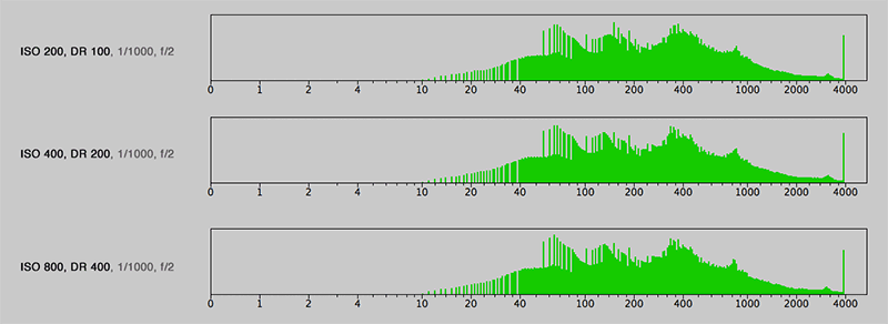 But, activating DR 200 effectively underexposes the RAW by one stop, and DR 400 by two stops. If the shutter speed and aperture are kept the same, an ISO 200 DR 100 RAW is exposed identically to an ISO 400 DR 200 RAW, which in turn is exposed identical to an ISO 800 DR 400 RAW. Rather than a stepped overexposure as would be expected in these scenarios, the RAW reveals identical exposures: