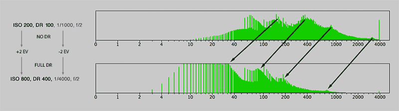 Then, in JPG development / RAW conversion the results are pushed back up a stop or two (DR 200 and DR 400 respectively) to effect the ISO equivalent the exposure was metered at, and the bright tones are "recovered" by the same amount. (In my example above, since there was no aperture/shutter compensation when ISO was increased, the DR 200 shot would now appear one stop overexposed, and the DR 400 would appear two stops overexposed, even though they are identical in RAW format.)